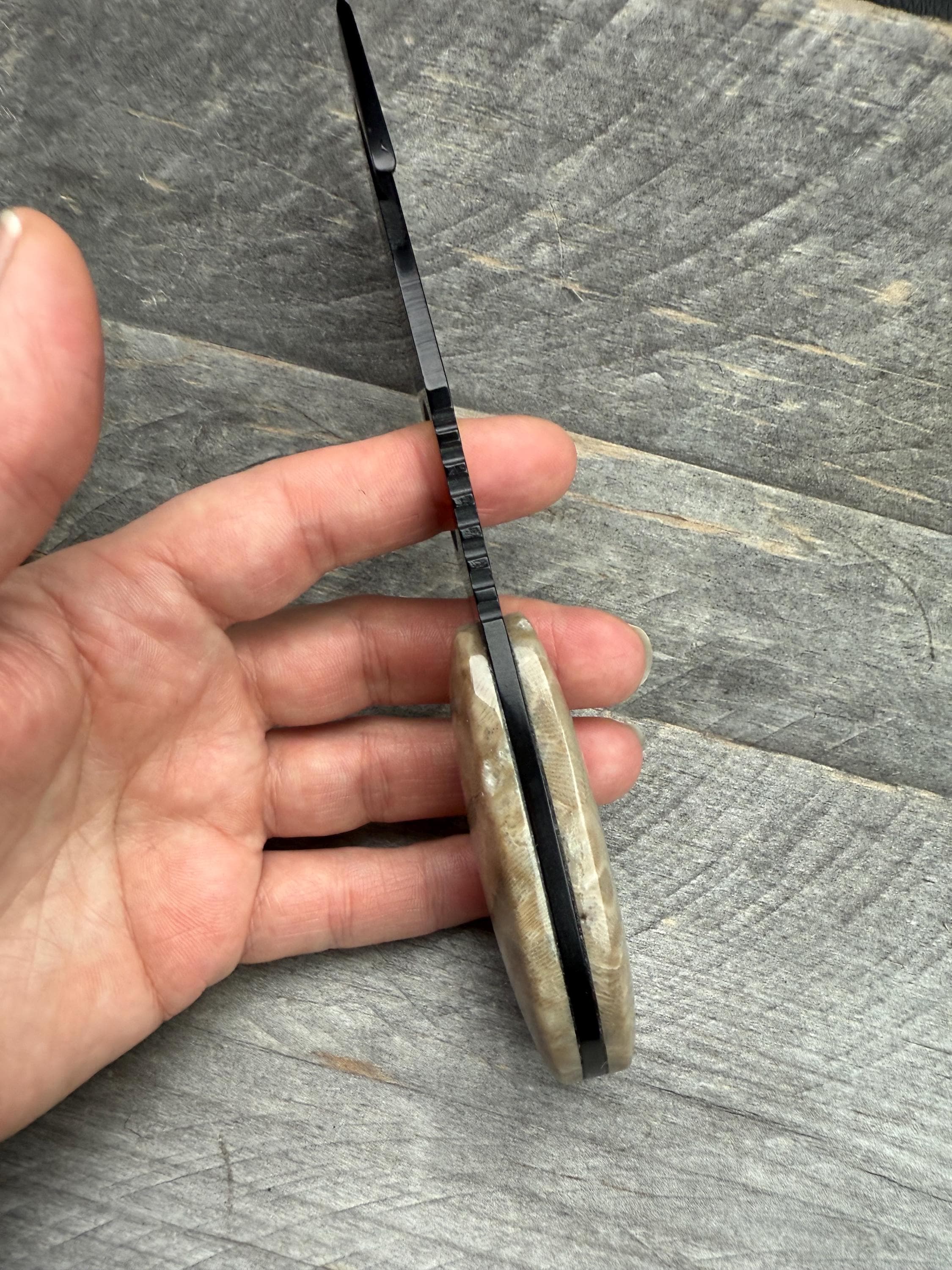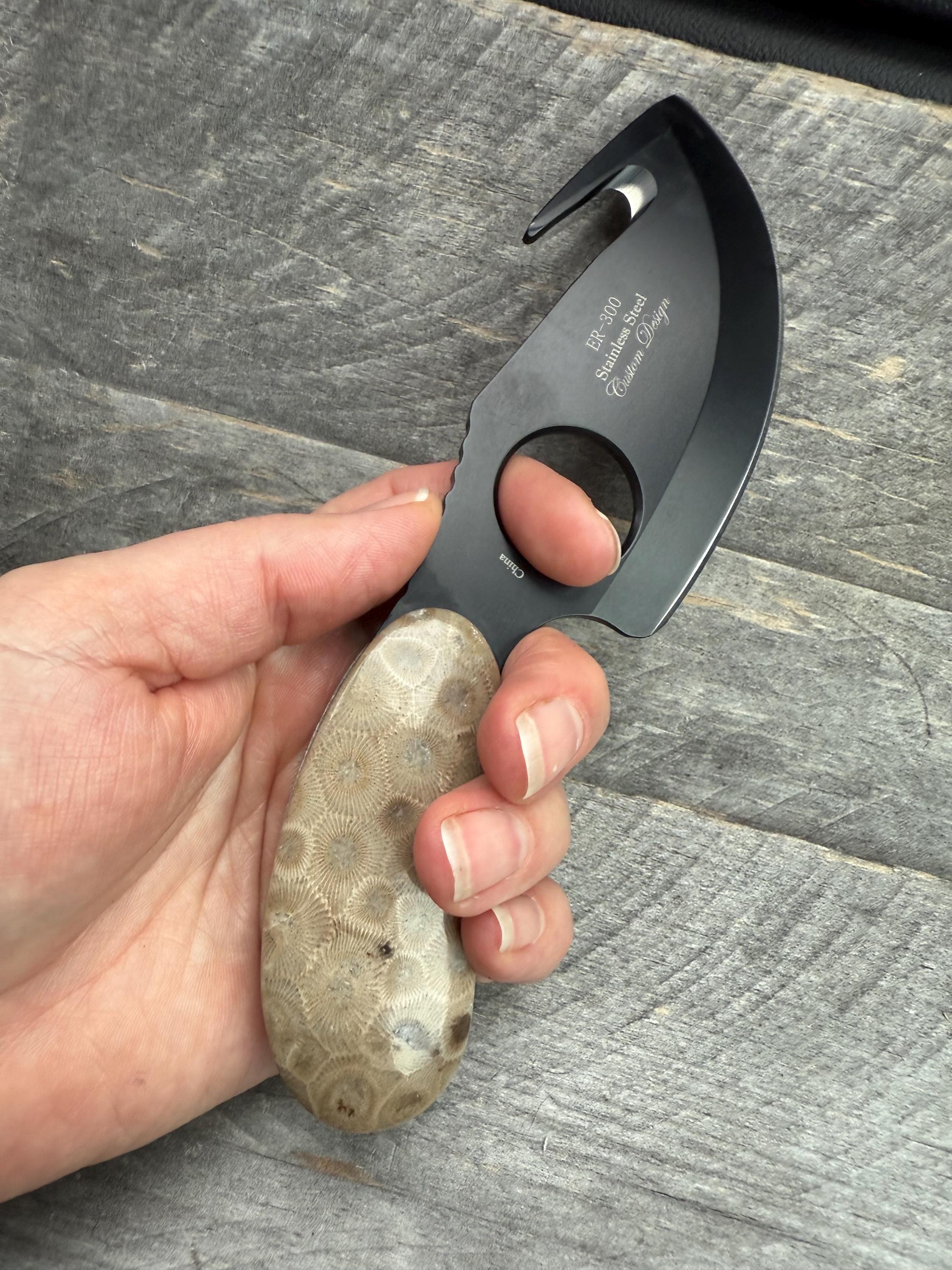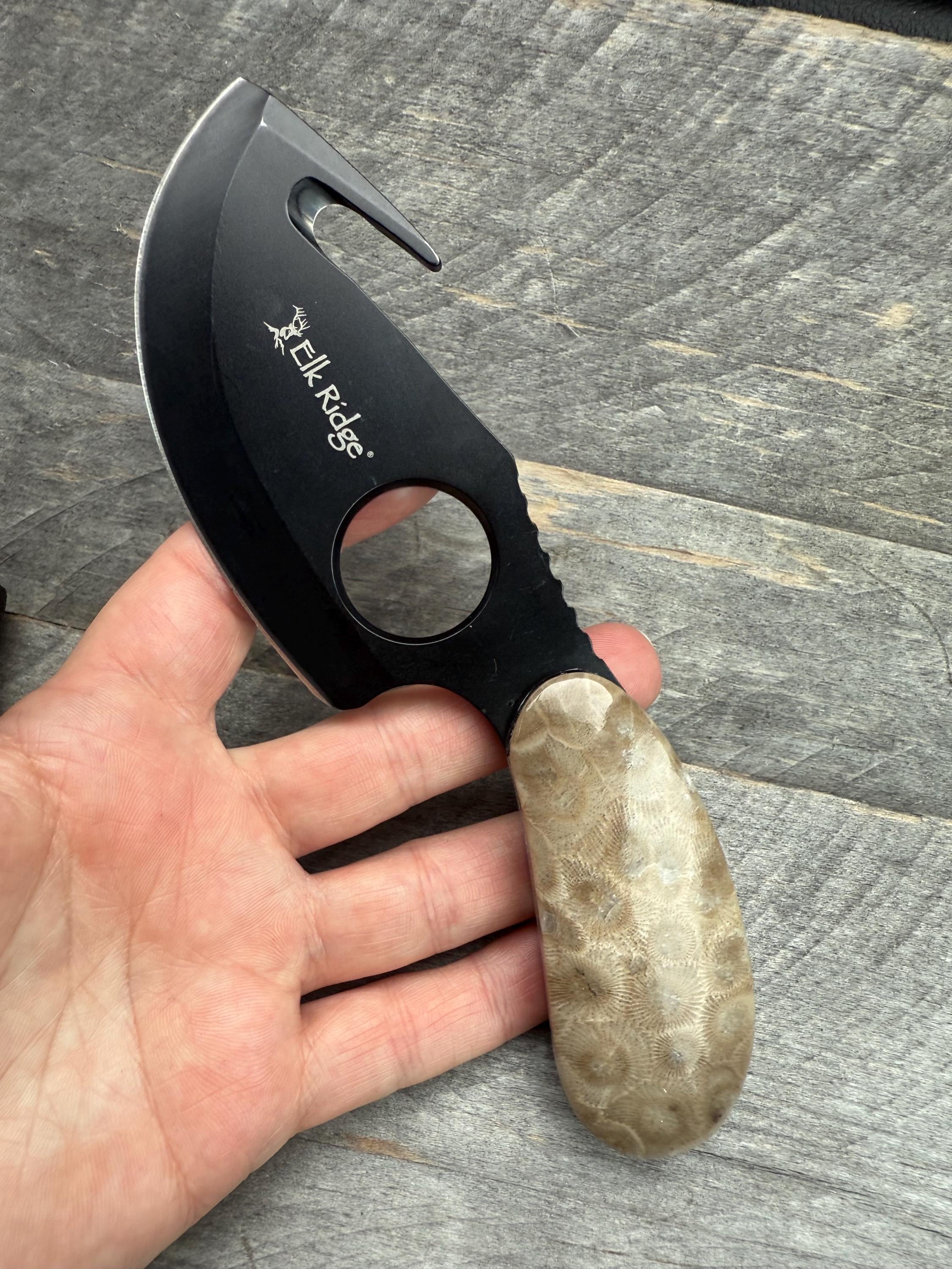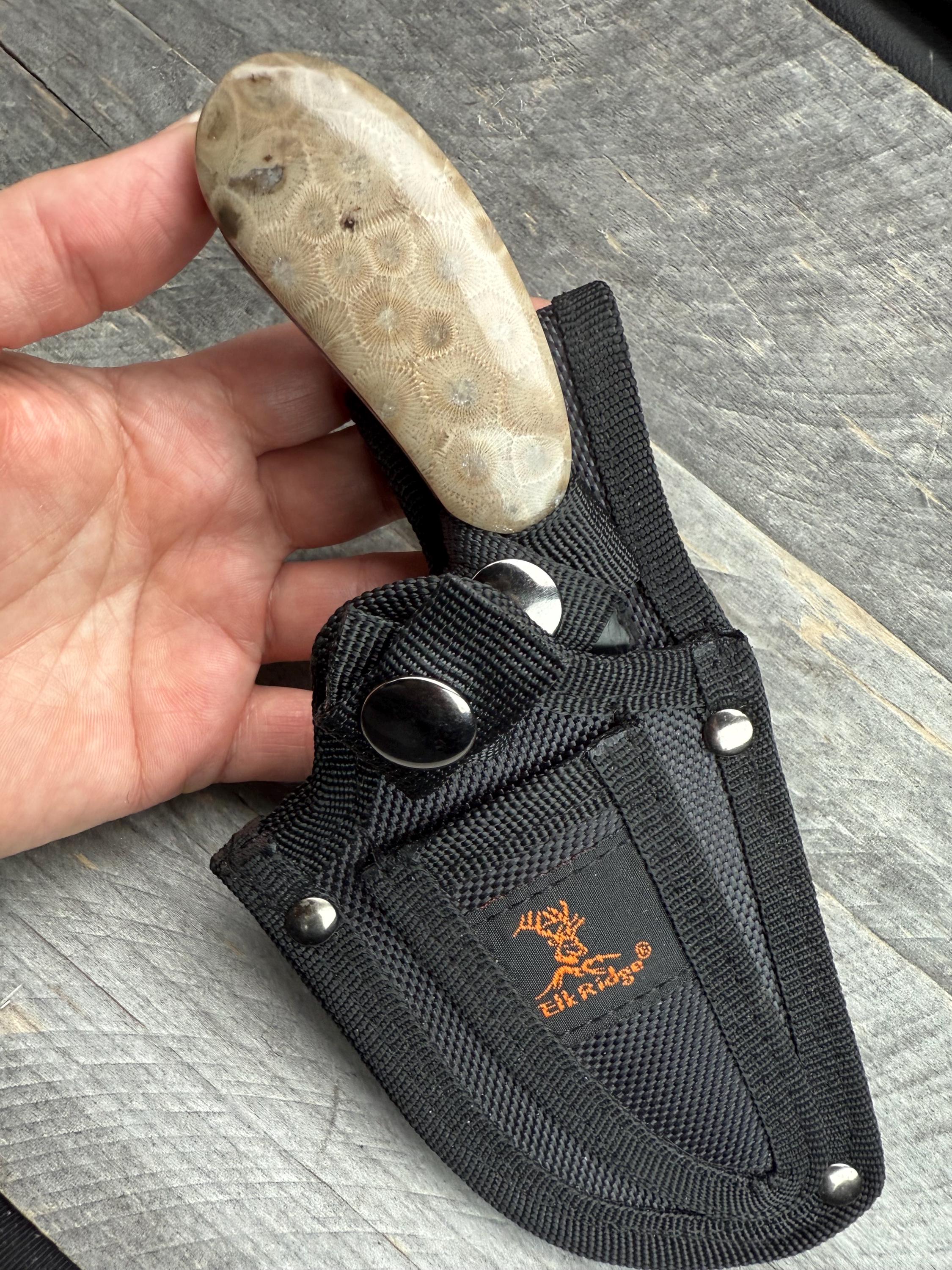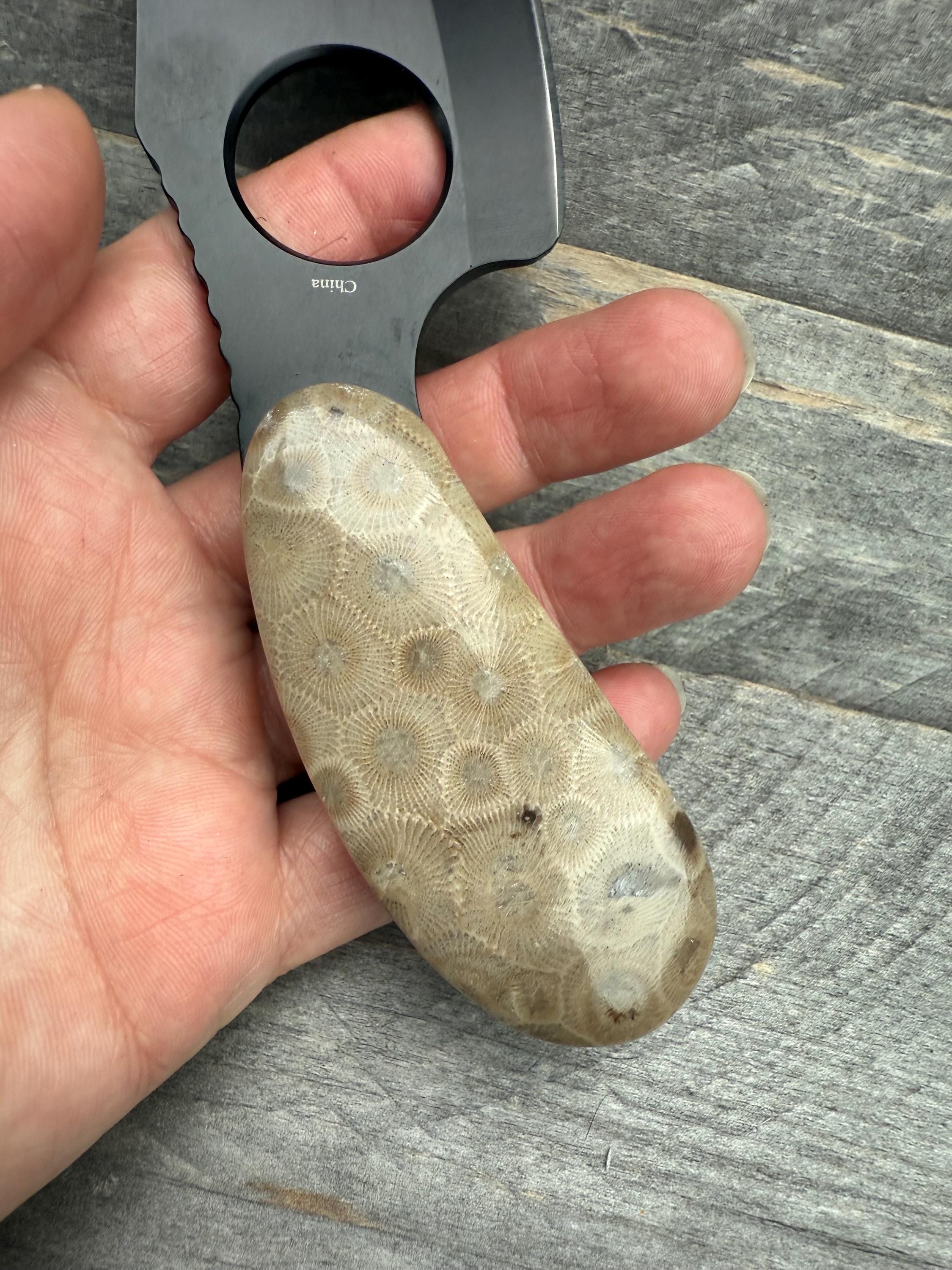 Take a look at these custom Petoskey Stone Handles! Its a brand new beautiful black stainless steel knife, with all natural Petoskey Stone handles! The knife is about 6 3/4" long from top to bottom, the Petoskey stones on them are about 2 7/8" long and the blade is 4 3/4".