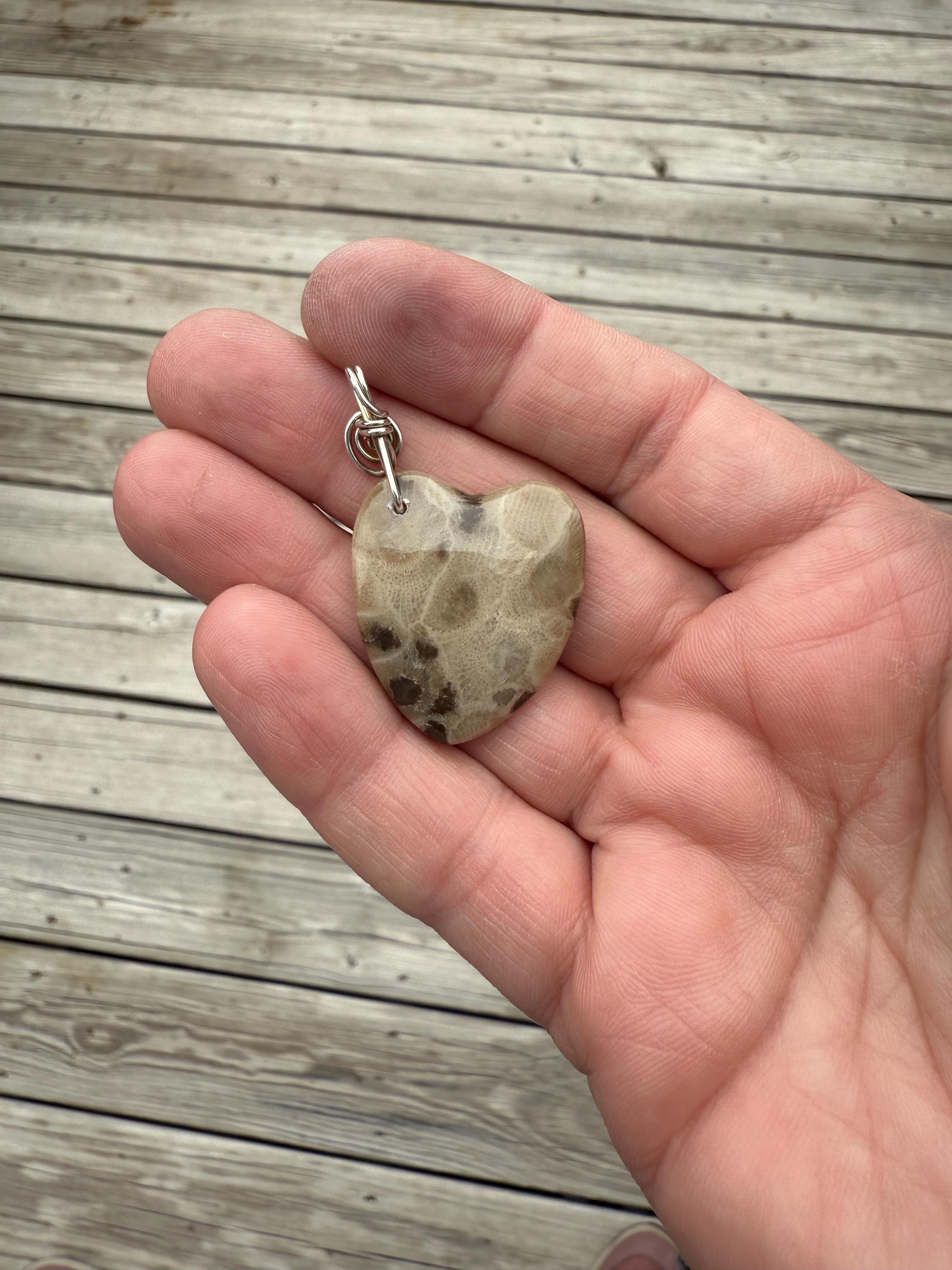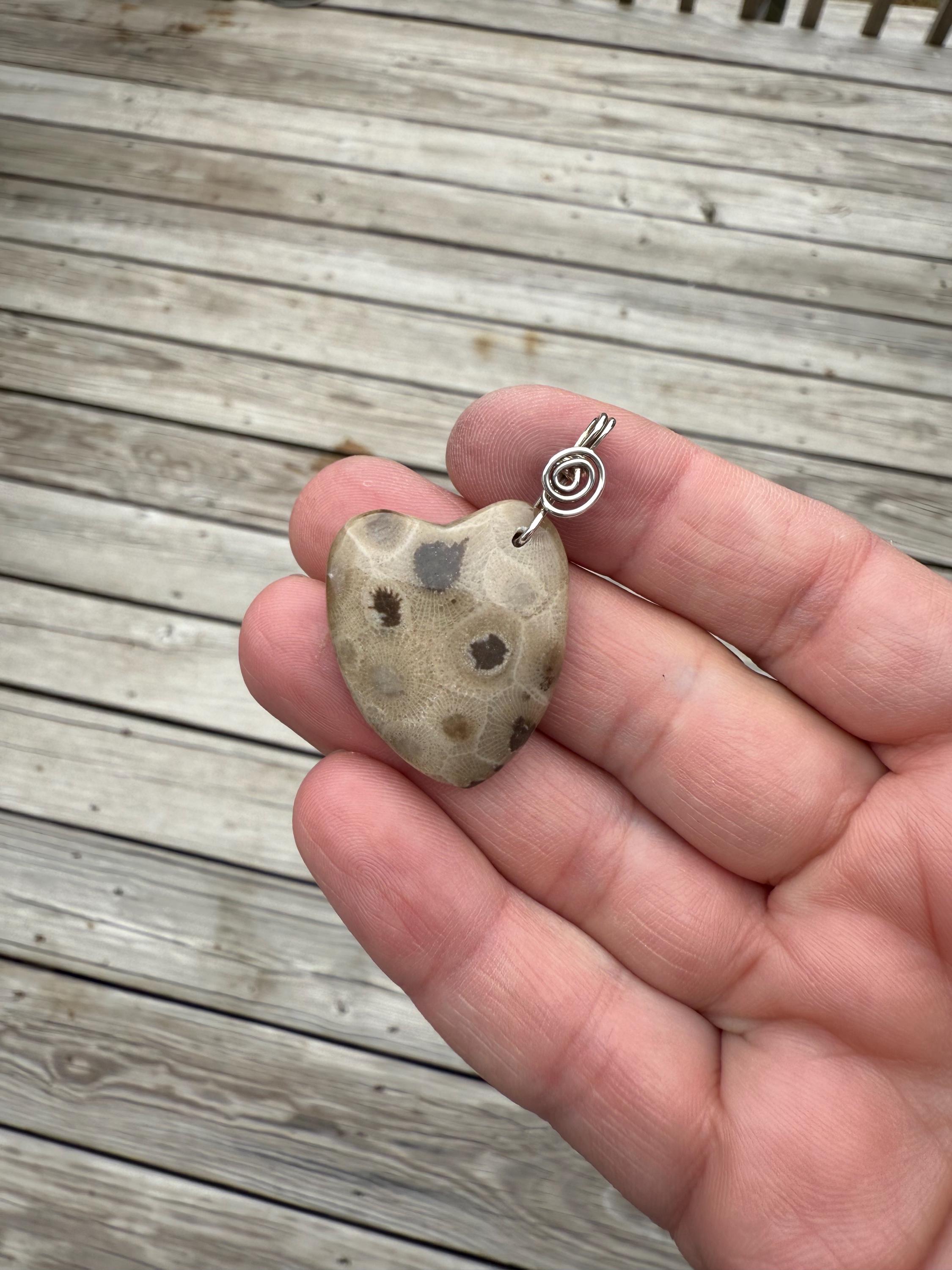 Sterling Silver Wire Wrapped Petoskey Stone Heart Pendant