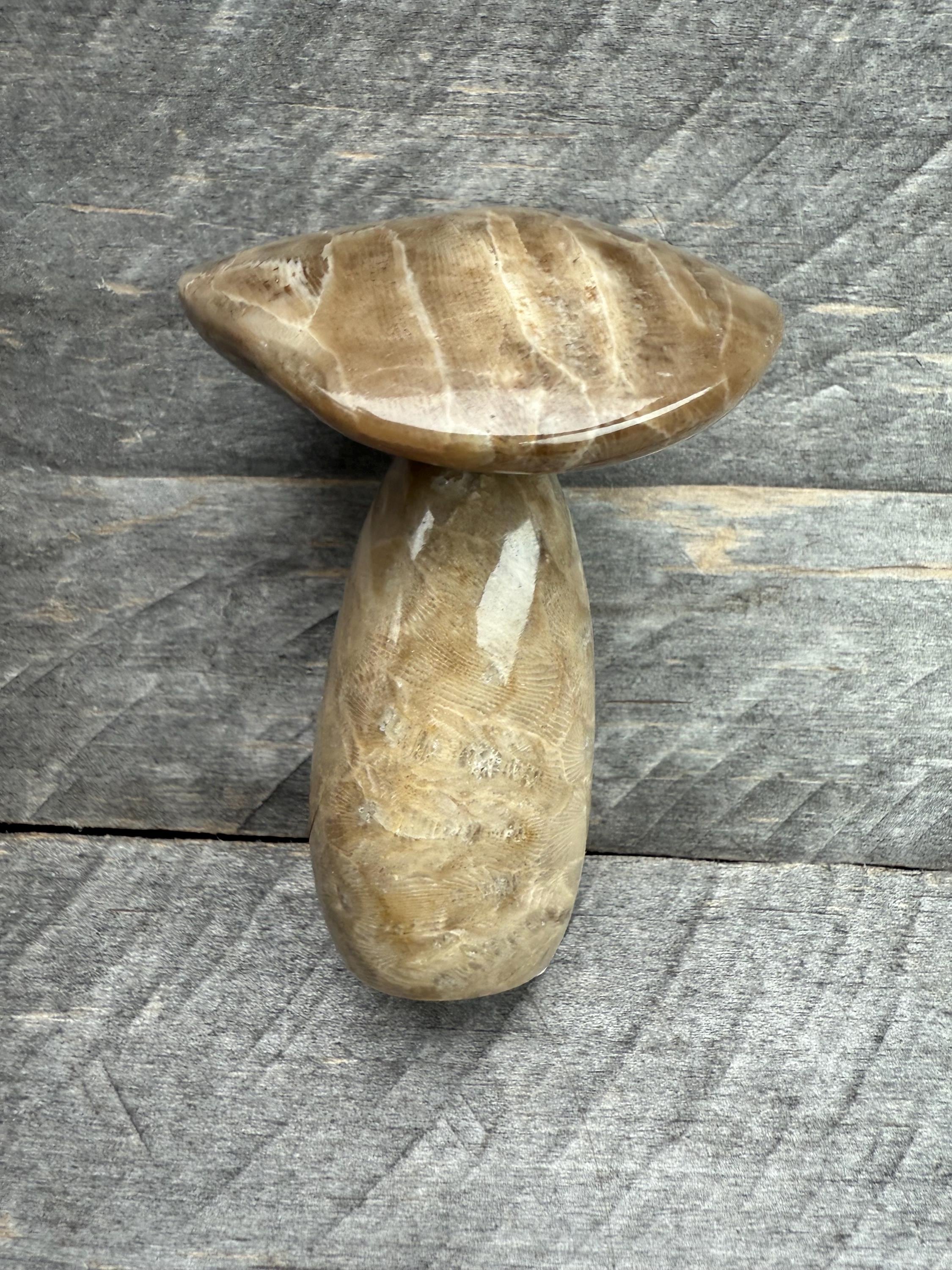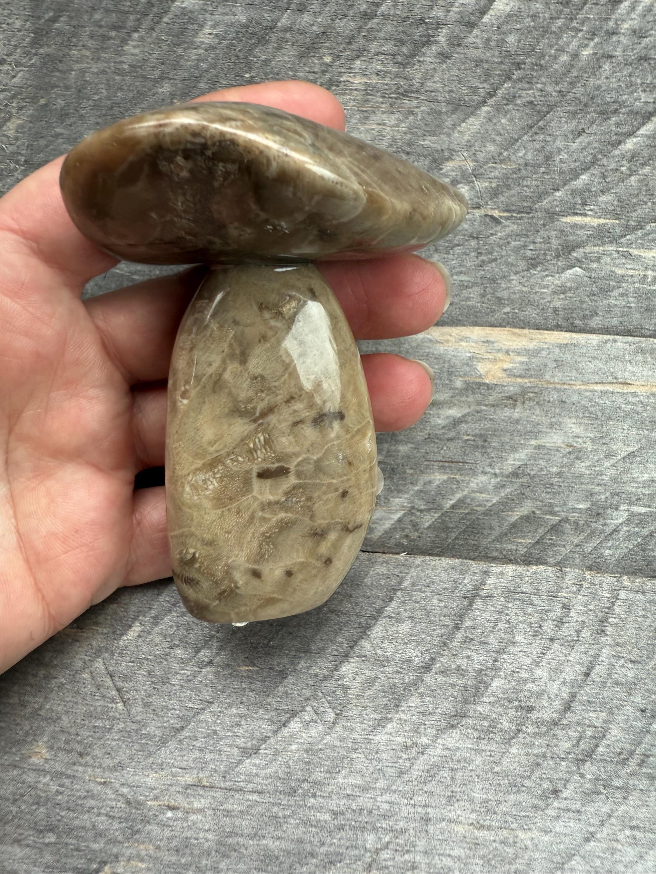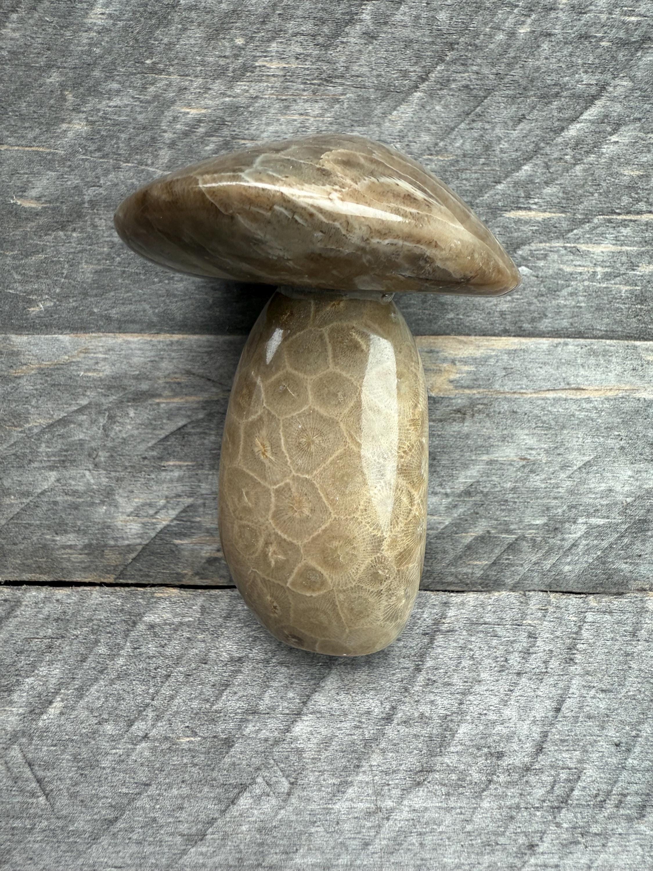 This adorable Petoskey Stone mushroom is made from two genuine Petoskey Stones — one forming the cap and the other the stem — carefully shaped, polished, and mounted together by hand right here in Northern Michigan!