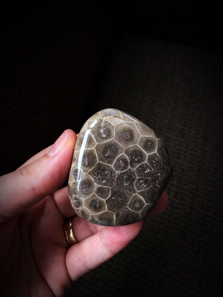 This piece would look amazing sitting anywhere in your home, office, or anywhere in between! It's a stand alone piece, perfect for that rockhound in your life! This Petoskey Stone is about 2" at it's widest point, and weights about 3.90oz!! If you're looking for a beautiful Petoskey Stone, here it is!!!