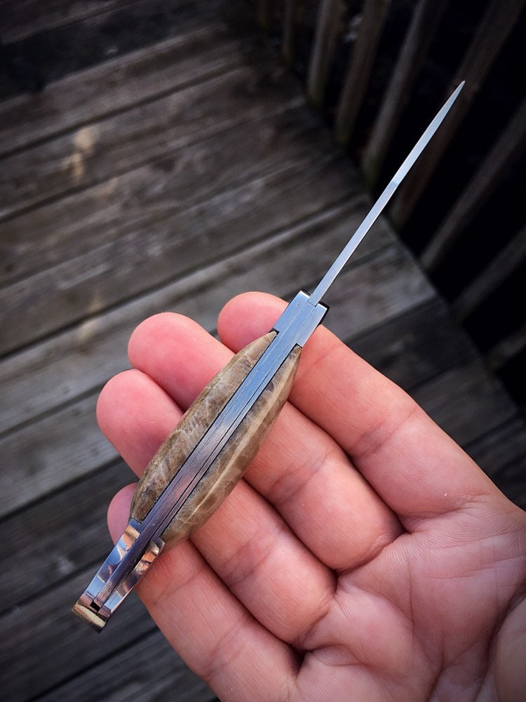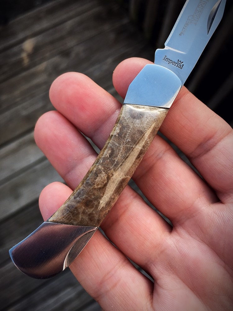 Take a look at these custom handles! It's a brand new stainless steel folding pocket knife, with all natural Petoskey Stone handles! The blade is about 2" and the overall length when open is 5” from tip to bottom of the handle. This is THE perfect size for a pocket knife! It is great for men and women! It would fit nicely in even the smallest of pockets and purses! Nothing has been added to these stones to give them the shine that they have! They have been sanded and buffed to the point that light reflects off the surface. This listing is for the pictured pocket knife and is definitely a one of a kind piece!!