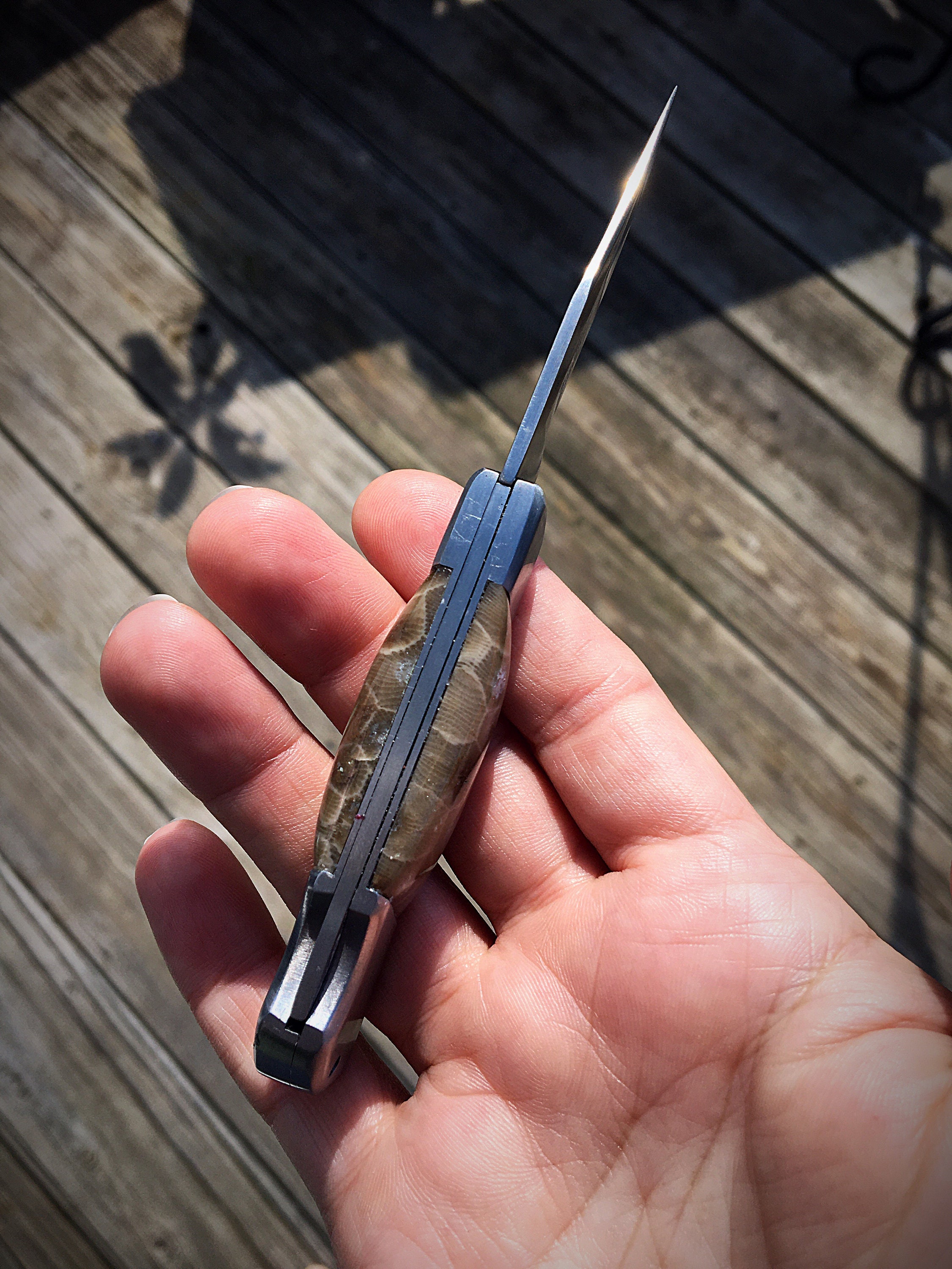 Take a look at these custom handles! It's a brand new stainless steel folding pocket knife, with all natural Petoskey Stone handles! The blade is about 2 1/4" and the overall length when open is 5 1/4" from tip to bottom of the handle. This is THE perfect size for a pocket knife! It is great for men and women! It would fit nicely in even the smallest of pockets and purses!