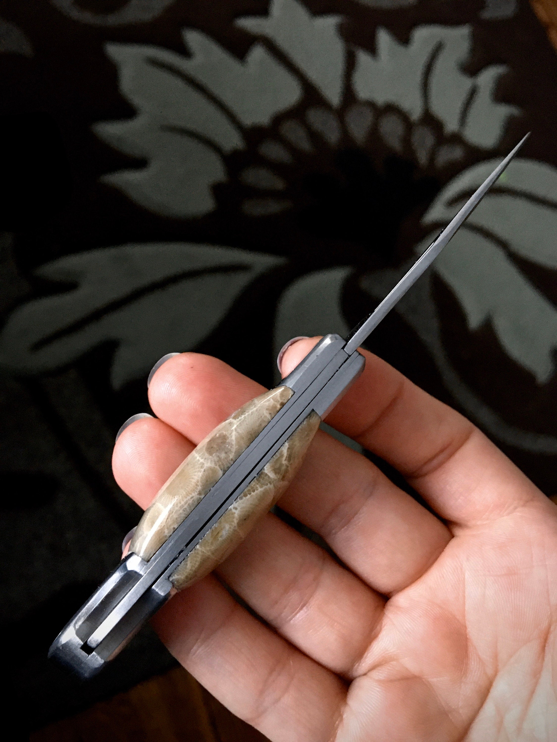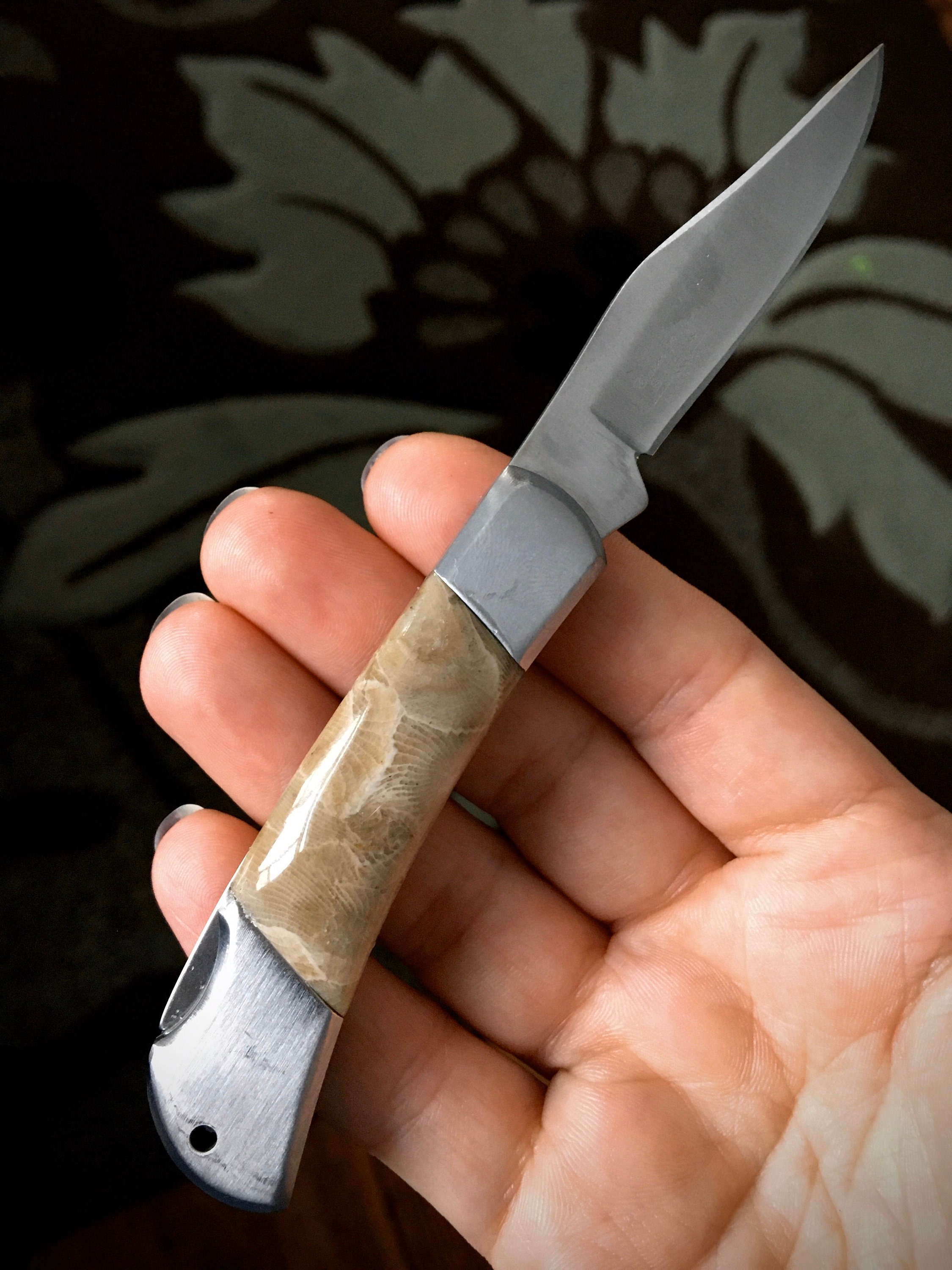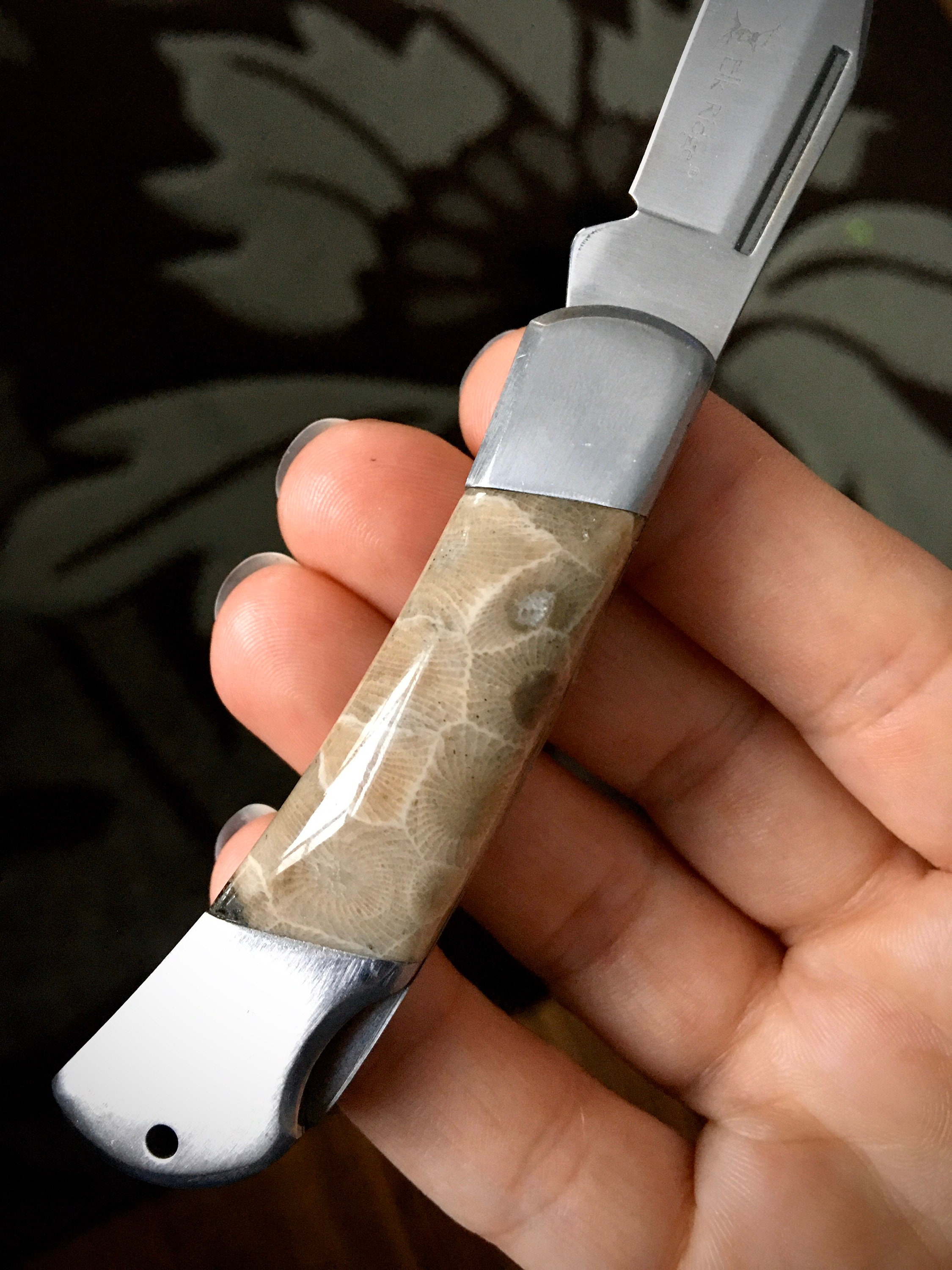 Take a look at these custom handles! It's a brand new stainless steel folding pocket knife, with all natural Petoskey Stone handles!